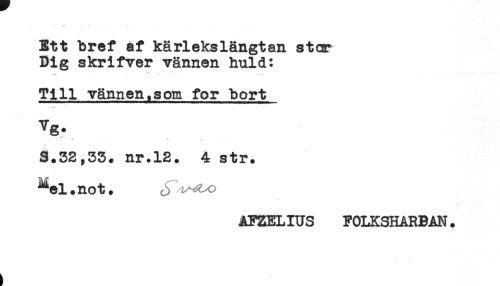 //// Ett bref af kärlekslängtan stor //// Dig skrifver vännen huld: //// * . . - - - //// Till vännen,som for bort //// *** * //// Vg. //// * <. * //// 3.32,33. nr.12. 4 str. //// ^el.not. ^ z^o //// AFZELIUS FOLKSHARBAN. ////