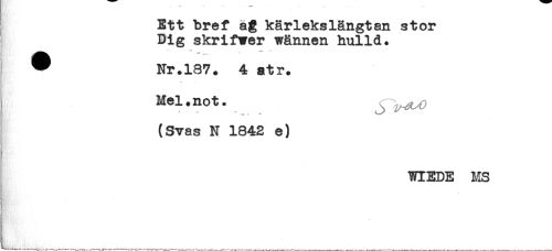 //// Ett bref åg kärlekslängtan stor //// Dig skrifwer wännen hulld* //// - ** //// ^ Nr.187. 4 atr. //// K //// Mel.not. ^ //// (Svas N 1842 e) //// WIEDE MS //// 4 ////