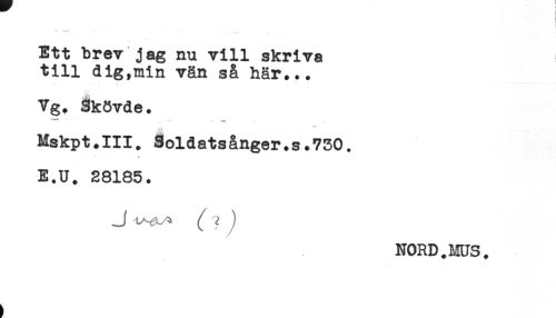 //// t //// Ett brev jag nu vill skriva //// till dig,min vän så här... //// Vg. Skövde. //// ...... - ... //// ** //// Mskpt.III. Soldatsånger.s.750. //// ** //// E.U. 28185. //// NORD.MUS. ////