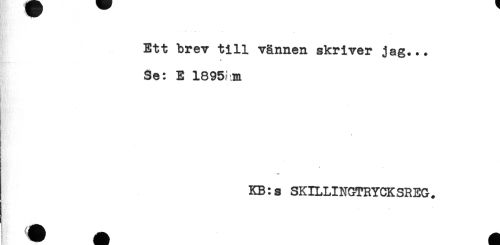 //// Ett brev till vännen skriver jag... //// Se: E 1895; m //// ' * //// * //// KB:s SKILLINGTRYCKSREG. ////