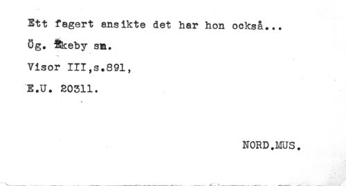 //// Ett fagert ansikte det har hon också... //// Cg. &keby sm. //// < t- //// "T //// Visor III,s.891, //// E.U. 20311. //// NORD. MUS. //// . ... ^ ////