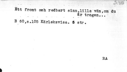 //// - - - * - - //// Ett fromt och redbart sinn,liila vän,om du //// är trogen... //// * *** - 4 * //// B 60,s.105 Kärleksvisa. 5 str. //// RA ////