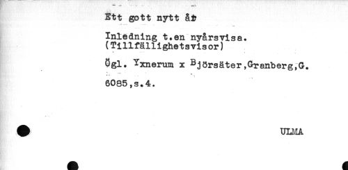 //// Ett gott nytt åt //// Inledning t.en nyårsvisa. //// (Tillfällighetsvisor) //// Ögl. Yxnemm x Björsäter,Chranberg,&. //// - ' ' .... - //// < //// 6085,s.4. //// # ULI.IA ////