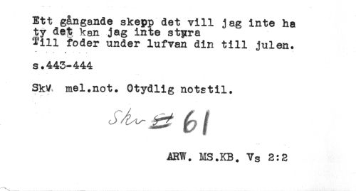 //// Ett gångande skepp det vill jag inte ha //// ty det kan jag inte styra //// Till foder under lufvan din till julen. //// ^ a //// s.445-444 //// SkV mel.not. Otydlig notstil. //// ARW. MS.KB. Vs 2:2 ////