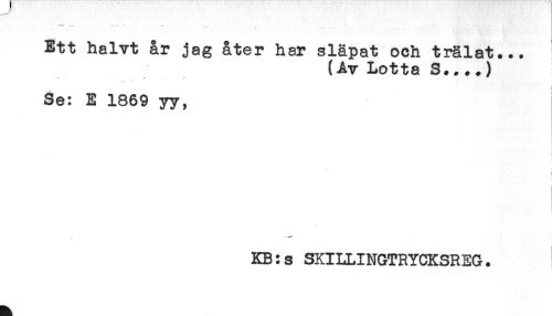 //// -i-f - - w - //// Ett halvt år jag åter har släpat och trälat... //// (Av Lotta S....) //// < //// Se: E 1869 yy, //// t //// i //// < //// KB:s SXILLINGTRYCKSREG. ////
