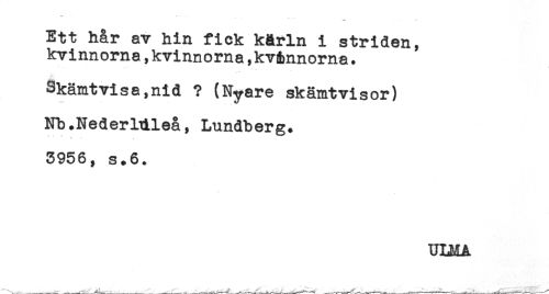 //// Ett hår av hin fick kärln i striden, //// kvinnorna,kvinnorna,kvAnnorna. //// Skämtvisa,nid ? (Nyare skämtvisor) //// Nb.Nederldleå, Lundberg. //// 3956, s.6. //// ULMA ////