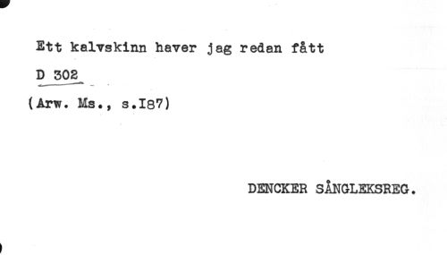 //// Ett kalvskinn haver jag redan fått //// D 302 //// (Arw. Ms., s.187) //// DENCKER SÅNGLEKSREG. ////