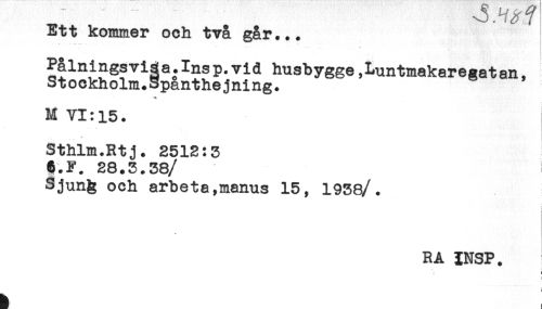 //// Ett kommer och två går... //// Palningsviåa.Insp. vid husbygge,Luntmakaregatan, //// Stookholm.Spånthejning. //// M YI:i5. //// Sthlm.Rtj. 2512:3 //// 6.F. 28.3.38 //// /Sjun^ och arbeta,manus 15, 1938/. //// < //// i //// r //// RA INSP. //// h ////