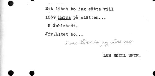 //// Hr' //// Ett litet bo jag sätta vill //// 1869 Hurra på slätten... //// E Sehlstedt. //// Jfr.Litet bo... //// LUB SKILL UNIK. ////