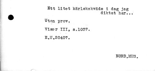 //// Ett litet kärlekskväde i dag jag //// diktat har... //// Utan prov. //// * - ^ //// Visor III, s.1037. //// 4 * .,.i //// E.U.20407. //// K". //// NORD.MUS. ////