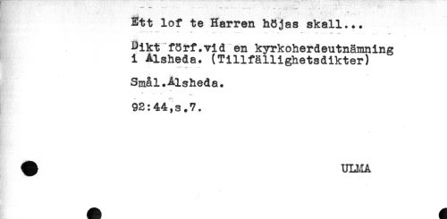 //// < * //// ,.< ' ' ' ' ' -t- - //// Ett lof te Herren höjas skall... //// '**'- ' -**- - ^ - . - ..... //// Dikt förf.vid en kyrkoherdeutnämning //// i Alsheda. (Tillfällighetsdikter) //// Smål.Alsheda. //// * //// 4 V //// 92:44,s.7. //// ^ ULI^IA ////