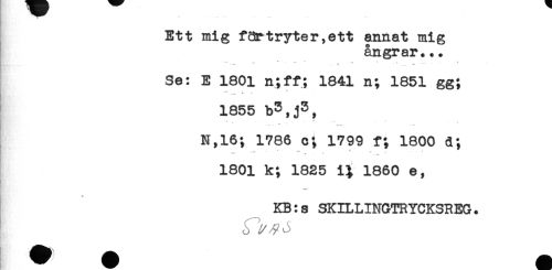 //// Ett mig fartryter,ett annat mig //// ångrar... //// ...... * //// Se: E 1801 n;ff; 1841 n; 1851 gg; //// 1855 b5,j3, //// N,16; 1786 c; 1799 f; 1800 d; //// 1801 k; 1825 1860 e, //// KB:s SKILLINGTRYCKSREG. //// y ^ o ////