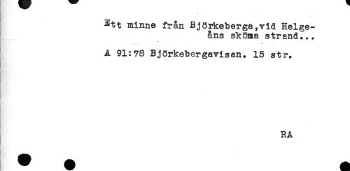 //// t //// Ett minne från Björkeberga,vid Helge- //// åns sköna strand... //// + , . - ' //// A 91:78 Björkebergavisan. 15 str. //// I RA ////