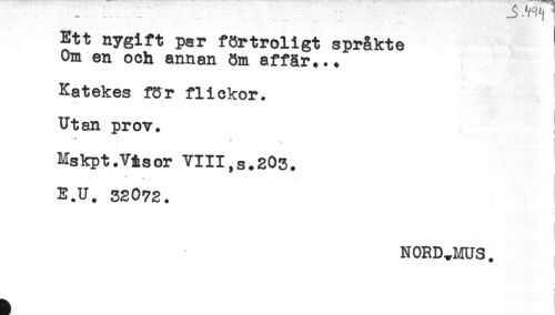 //// *** - _____* t //// Ett nygift par förtroligt språkte //// Om en och annan öm affär... //// Katekes för flickor. //// Utan prov. //// - - ' - - < .. i //// t //// Mskpt.Våsor YIIl,s.205. //// * . //// E.U. 32072. //// NORD^MUS. //// ! ////