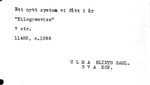 //// Ett nytt system vi fått i år //// "Kilogramvisa" //// < //// 7 str. //// 11482, s.1066 //// U L M Å BLIXTS SAML. //// SVA KOP. ////