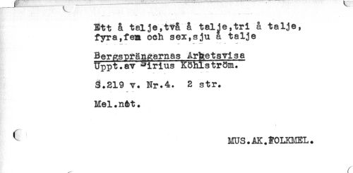 //// Ett å tal je, två å talje,tri å talje, //// fyra,fem och sex,sju a talje //// - . -- - - ^ ^ - ^ - //// Berp;spränp;arnäs Arbetsvisa //// Uppt.av ^irius Köhlström. //// i ** //// 3.219 v. Nr.4. 2 str. //// Mel.n&t. //// < //// ^ MUS.AK.^0LKI,1EL. //// //// /