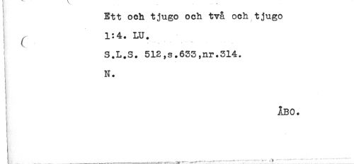 //// Ett och tjugo och två och tjugo //// 1:4. LU. //// ( //// S.L.S. 512,s.633,nr.314. //// : N. //// : ÅBO. //// : //// ___.__-----" ^ ....... ////