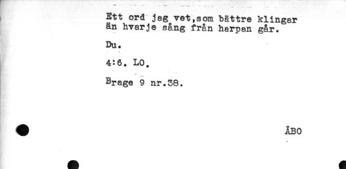 //// i Ett ord jag vet,som bättre klingar //// än hvarje sång från harpan går. //// Du. //// 4:6. LO. //// Brage 9 nr.38. //// # ÅBO //// j* ////