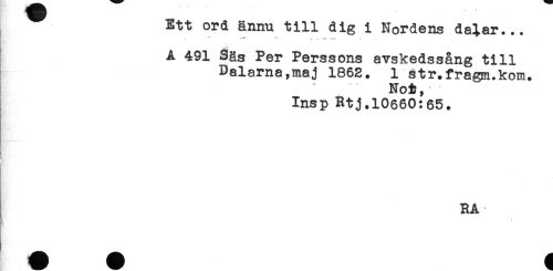 //// Ett ord ännu till dig i Nordens dalar... //// A 491 Säs Per Perssons avskedssång till //// Dalarna,maj 1862. 1 str.fragm.kom. //// Not, //// Insp Rtj.10660:65. //// RA- ////