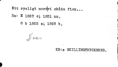 //// Ett rysligt mord^l skåda fick... //// Se: E 1823 c; 1851 nn, //// - - .. * - //// 5 //// 0 b 1822 a; 1823 b, //// ' //// J, i //// ... //// KB:s SKILLINGTRYCKSREG. //// c //// j //// F //// r ////
