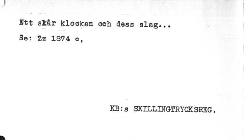 //// ***** *** - . . ^ . //// Ett står klockan och dess slag... //// - - //// Se: Zz 1874 c, //// i //// KB:s SKILLINGTRYCKSREG. ////
