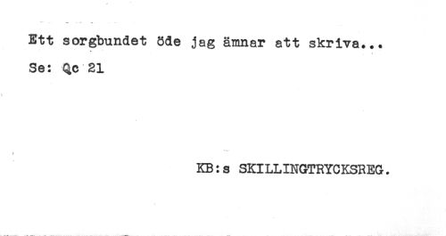 //// Ett sorgbundet öde jag ämnar att skriva... //// . //// Se: Qc 21 //// * v.* //// ; //// KB:s SKILLINGTRYCKSREG. ////