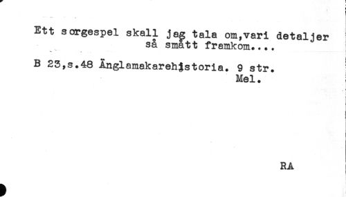 //// Ett sorgespel skall ja^ tala om,vari detaljer //// så smått framkom*... //// -***-' r //// B 23,s.48 Anglamakareh^storia. 9 str. //// Mel. //// * - //// f //// . //// RA ////