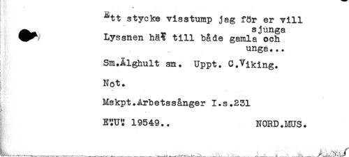 //// ^tt stycke visstump jag för er vill //// ^- „ sjunga //// ^^ Lyssnen hät till b&de gamla och //// unga... //// Sm.Ålghult sn. Uppt. C.Viking. //// j //// Not. //// ! '* i ' //// Mskpt.Arbetsgånger I.s^231 //// yt //// ESUT 19549.. NORD.MUS. ////