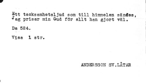 //// Ett tacksamhetsljud som till himmelen säntEes, //// Jag prisar min Gud för allt han gjort väl. //// - * , i //// t //// Da 524. //// -t-. * * //// Visa 1 str. //// i //// ANDERSSON SY.LÅTAR ////
