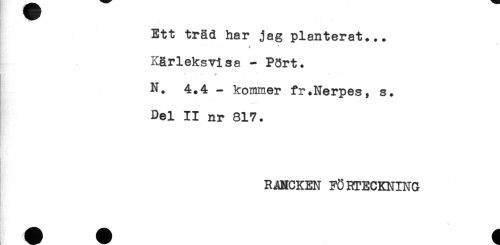 //// Ett träd har jag planterat... //// Kärleksvisa - P8rt. //// N. 4.4 - kommer fr*Nerpes, s. //// Del II nr 817. //// RANCKEN FÖRTECKNING ////