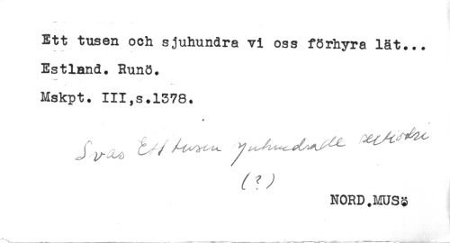 //// Ett tusen och sjuhundra vi oss fSrhyra lät... //// Estland. Runö. //// * //// Mskpt. III,s.1378. //// * //// * //// NORD.MUSS ////
