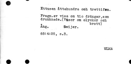 //// Ettusen åttahundra och trettifem. //// <W - - - //// Fragm.av visa om tio drängar,son //// drunknade.(V&sor om olyckor och //// . brott) //// Ang. Beijer. //// ' * ^ - * //// 68:4:25, s.5. //// K' <' <. //// BLMA ////