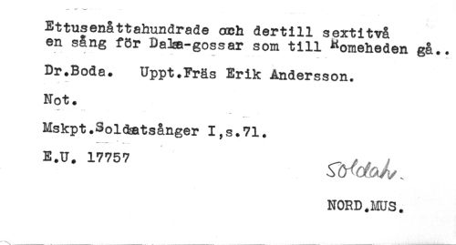 //// Ettusenåttahundrade cosh därtill sextitvå //// en säng för Dalas-gossar som till Komeheden gå.. //// -* * - //// Dr.Boda. Uppt.Fräs Erik Andersson. //// Not. //// Mskpt.Soldsatsånger I,s.71. ////
