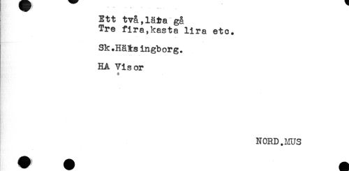 //// Ett två,lä&a gå //// Tre fira,kasta lira etc. //// Sk.HäRsingborg. //// HA Visor //// $ //// NORD.MUS //// c. ////