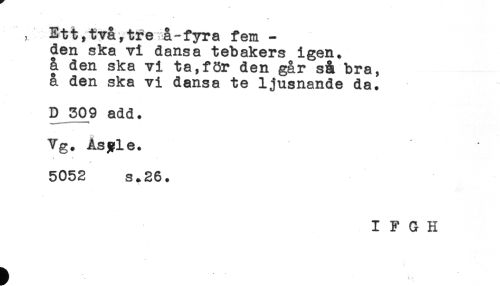 //// , Ett,två,tre å-fyra fem - //// den ska vi dansa tebakers igen. //// å den ska vi ta,för den går s& bra, //// å den ska vi dansa te ljusnande da. //// D 309 add. //// Vg. Asyle. //// \ * < //// 5052 s.26. //// I F G H ////