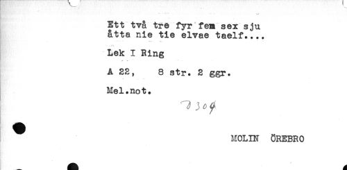 //// - - -- -. . ^ //// Ett två tre fyr fem sex sju //// åtta nie tie elvae taelf.... //// Lek I Ring //// A 22, 8 str. 2 ggr. //// Mel.not. //// ^ MOLIN ÖREBRO ////