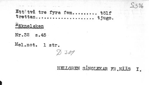 //// - - - ^UG //// Ett'två tre fyra fem.... t81f //// trettan.... tjugo. //// ^äkneleken //// . - //// Nr.33 s.45 //// Mel.not. 1 str. //// HELLGREN SÅNGLEKAR FR.NÄAS 1. ////