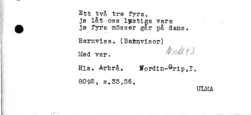 //// Kr-'' //// I Ett två tre fyra, //// ja låt oss lysti^a vara //// ^ ja fyra mösser gar på dans. //// Barnvisa. (Barnvisor) //// Med var. //// I Hls. Arbrå. Nordin-&rip,I. //// 8092, s.33,36. //// }i ULMA ////
