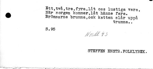 //// Ett,tva,tre,fyra,låt oss lustiga vara, //// ^ När sorgen kommer,låt hänne fara. //// ^ Brömsarne brumma,ock katten slår uppå //// trumma.. //// S.95 //// STEFFEN ENSTR.FOLKLYREK. ////