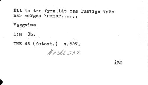 //// . . t //// Ett tu tre fyra,låt oss lustiga vara //// när sorgen kommer...... //// f //// Vaggvisa //// t //// 1:8 6b. //// i //// INE 42 (fotost.) s.527. //// ÅBO ////