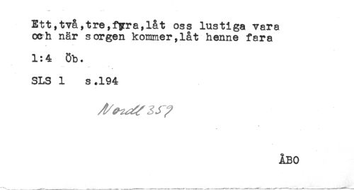 //// Ett,två,tre,fyra,låt oss lustiga vara //// och när sorgen kommer,låt henne fara //// 1:4 8b. //// SLS 1 s.194 ////
