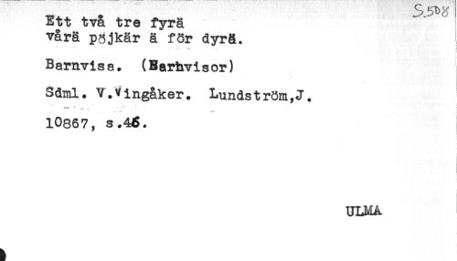 //// Ett två tre fyra //// våra psjkår ä för dyrå. //// - -^ - - . .. ' ! //// Barnvisa. (Barhvisor) //// < //// Sdml. V.Vingåker. Lundström,J. //// ' - - .* ' , _ f //// 10867, s.46. //// ! //// ULMA ////