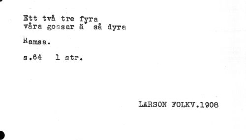 //// Ett två tre fyra //// våra gossar ä så dyra //// Ramsa. //// s+64 1 str. //// LÅRSON F0LKV.1908 ////