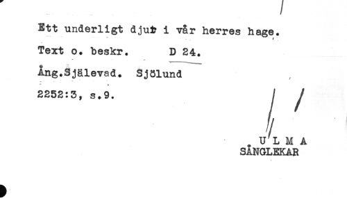 //// Ett underligt djut i vår herres hage. //// Text o. beskr. D 24. //// Ang.Själevad. Sjölund //// - //// 2252:3, s.9. / ^ //// . U^L M A //// SANGLEKAR ////