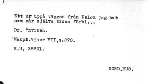 //// Ett ur uppå väggen fr&n Dalom jag ha i? //// som gar själva tiden förbi... //// Dr. inviken. //// * //// 'Mskpt.Visor VII,s.278. //// E.U. 28891. //// //// /