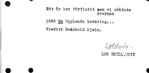 //// Ett &r har förflutit sen vi skådade //// hvarann //// 1862 Se Upplands beväring... //// Fredrik Reinhold Hjelm. //// LUB SKILL.UNIK ////