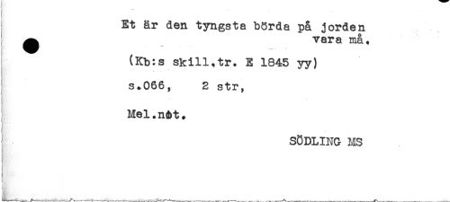 //// t //// Et är den tyngsta börda på jorden //// ^ vara må* //// (Kb:s skill.tr. E 1845 yy) //// s * //// ! //// I s.066, 2 str, //// Mel.n&t. //// * //// SÖDLING MS //// ! //// ,--- - - ----- ---- -----*-<*---^-- ---- - P ____- -^r-----^ - - ---- ---- ... - ___ ////
