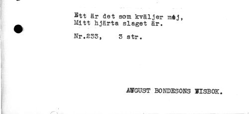 //// y "* - ..... .. " //// Ett är det som kväljer m&j, //// Mitt hjärta slaget är. //// Nr.233, 3 str. //// AUGUST BONDESONS BISBOK. //// \ < ____ ___ ////