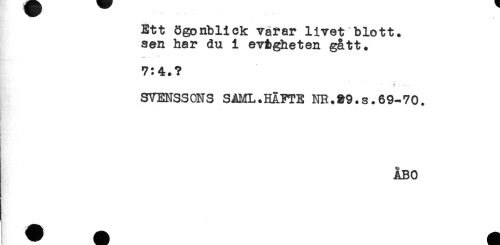 //// Ett ögonblick varar livet blott, //// sen har du i evtgheten gått. //// 7:4.? //// ^ - * //// SVENSSONS SAML.HÄFTE NR.39.s.69-70. //// ÅBO ////