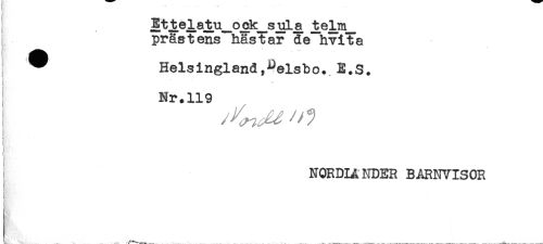 //// Etjt e^at^o ek^s ul^a telm //// prästens hästar de hvita //// ^ Helsingland,^elsbo. E.S. //// )' - .. //// Nr.119 //// i //// ! NORDMNDER BARNVISOR //// { ////